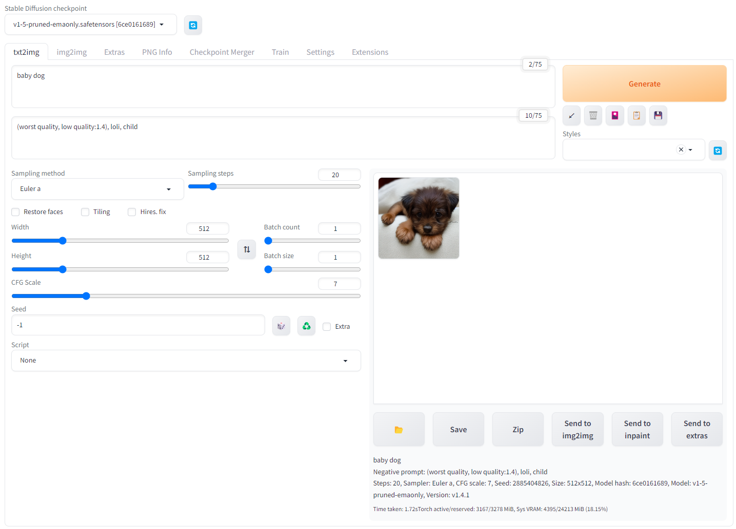 "txt2img"에 그리고자 하는 그림의 텍스트를 입력하고 "Generate"를 누르면 그림이 그려집니다.